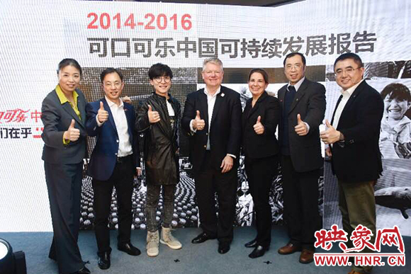 可口可樂中國(guó)攜手合作伙伴發(fā)布2014-2016可持續(xù)發(fā)展報(bào)告(左起:可口可樂大中華及韓國(guó)區(qū)副總裁張華瑩、壹基金秘書長(zhǎng)李勁、創(chuàng)作型歌手王嘯坤、可口可樂大中華及韓國(guó)區(qū)總裁馮廣晟、世界自然基金會(huì)全球淡水項(xiàng)目高級(jí)官員Judy Takas、世界自然基金會(huì)中國(guó)淡水項(xiàng)目總監(jiān)任文偉博士、可口可樂大中華及韓國(guó)區(qū)副總裁張建弢)