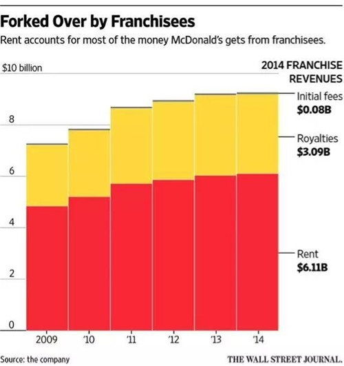 這是雷·克羅克在早期設計麥當勞的特許經(jīng)營模式時,就留下的一個獨到之處:為了加強控制權(quán),所有門店所需要的土地物業(yè),都要由麥當勞總部出面收購,再轉(zhuǎn)租給特許經(jīng)營商,每年按略低于市場價的水平收購租金。在房地產(chǎn)市場節(jié)節(jié)攀升時,租金收入會水漲船高;而一旦特許經(jīng)營商表現(xiàn)欠佳,也可以隨時將他們“掃地出門”。一些持有麥當勞股票的對沖基金經(jīng)理們甚至曾經(jīng)想過,把麥當勞的餐飲和房地產(chǎn)業(yè)務拆分成兩部分,以便更有效地管理資產(chǎn)。