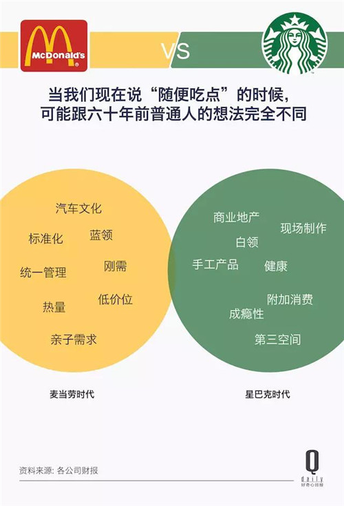 星巴克提供的則是一種體驗,是食物之外的那一部分空間概念:消費者來到店內(nèi),更多是尋求家與辦公室之外用于放松、社交的第三空間,咖啡飲品僅是附加服務。