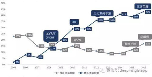 基于公司的財(cái)報(bào)和艾瑞的數(shù)據(jù),我們做出了兩家公司在游戲市場(chǎng)份額的變化趨勢(shì),2008年是一個(gè)明顯的轉(zhuǎn)折點(diǎn),這一年騰訊開(kāi)始超越網(wǎng)易,2008-2010年三年的時(shí)間,騰訊通過(guò)LOL、DNF、QQ飛車(chē)、CF等爆款把游戲市場(chǎng)份額從6%提高到了接近30%。