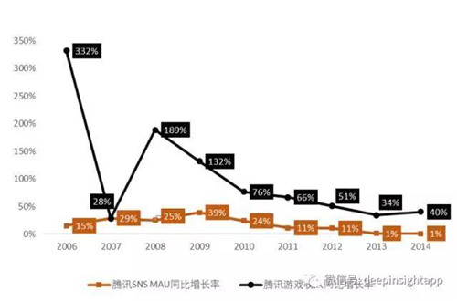 可以看到,騰訊SNS的MAU一直保持著一個(gè)較為穩(wěn)定的增長(zhǎng)率,而游戲收入增長(zhǎng)率的波動(dòng)相對(duì)較大,兩組數(shù)據(jù)并沒(méi)有出現(xiàn)很強(qiáng)的正相關(guān)。