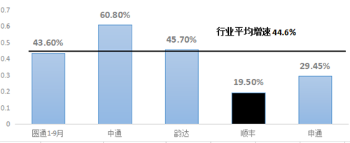 順豐在2016年的國內(nèi)快遞業(yè)務(時效產(chǎn)品,不包括其重貨、冷運、倉配業(yè)務,這些也未計入郵政局快遞統(tǒng)計)收入增速只有15%左右。整體收入增速19.5%也遠遠落后于行業(yè)同期的44.6%?;乜唇陻?shù)據(jù),其增速早與行業(yè)脫節(jié),且差距拉大。在2016年低于行業(yè)25個點,低于申通圓通一半,不足中通1/3。