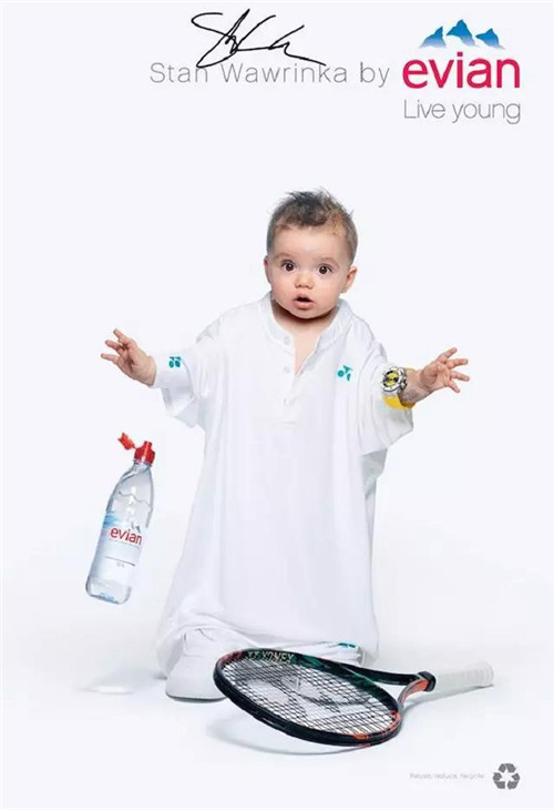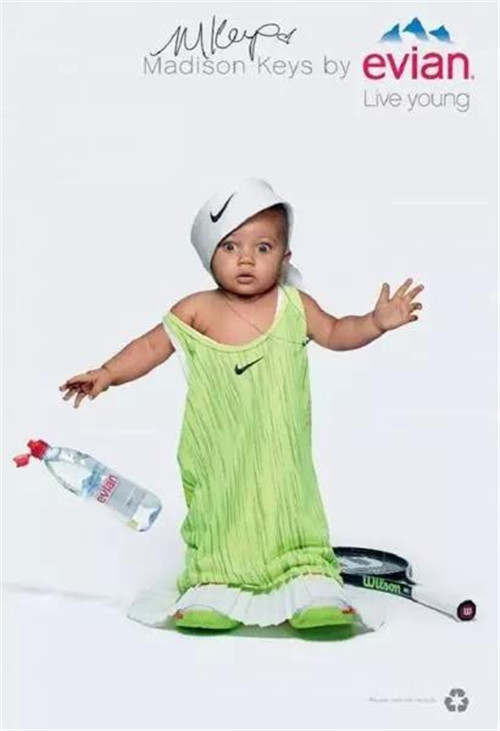 針對戶外、數(shù)字和社交網(wǎng)絡(luò)的創(chuàng)意則主要集中在一個(gè) Evian Young Team 的概念,一個(gè)由依云代言人莎拉波娃、Stan Wawrinka、Lucas Pouille、Madison Keys 以及高爾夫球員 Lydia Ko 等人組成的團(tuán)隊(duì)來拍攝廣告的主要視覺:喝了依云水之后,他們都換上一套 Oversize 的運(yùn)動服,“變成了嬰兒”。