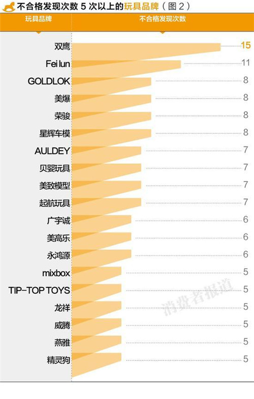 雙鷹與飛輪的不合格次數(shù)超過(guò)10次,而美高樂、星輝車模等較知名品牌也數(shù)次登上黑榜。兒童玩具的抽檢不合格項(xiàng)目主要集中在標(biāo)志與危險(xiǎn)警示不規(guī)范、以及小零件、尖端傷害等方面。