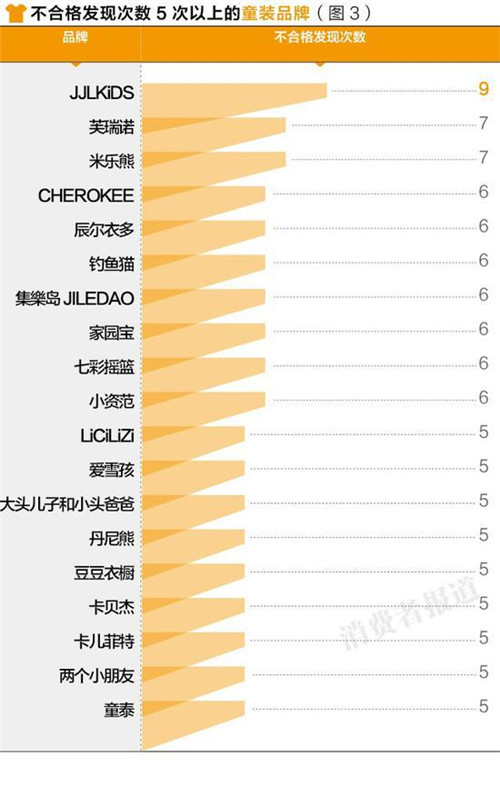 數(shù)據(jù)分析顯示,由郭濤父子代言的有30年創(chuàng)立歷史的季季樂(JJLKIDS)童裝的不合格發(fā)現(xiàn)次數(shù)竟高達(dá)9次。而兒童與嬰幼兒服飾的不合格項(xiàng)目集中在標(biāo)識(shí)、纖維含量、pH值、使用說(shuō)明等方面。