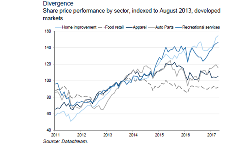 零售商大批破產(chǎn)的同時(shí),一些對(duì)電商“免疫”的行業(yè),在過(guò)去幾年表現(xiàn)卻明顯優(yōu)于其他消費(fèi)類行業(yè)。高盛在一篇報(bào)告中總結(jié)了以下四類:1、線下體驗(yàn)型消費(fèi)(如游樂(lè)場(chǎng));2、“大件”商品和服務(wù)(如家具、教育);3、B2B類商品(如工業(yè)零件);4、有監(jiān)管約束的商品(如藥品)。