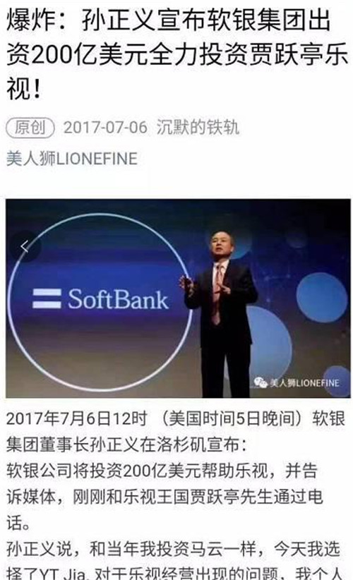 凡是相信“孫正義投資樂視200億美元”的人智商都需要充值。第一,軟銀自己因為巨資收購ARM資金鏈都很緊,哪來這么多現(xiàn)金?第二,這個世界上沒任何互聯(lián)網(wǎng)公司能拿到單筆超過50億美元的投資。第三,文章那么多驚嘆號……孫正義表示這個鍋我不背!一看就是個憤憤蹭熱點的,不值得為這種垃圾信息浪費時間