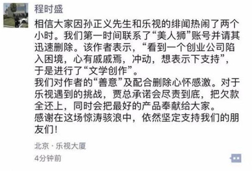 程時盛在朋友圈中寫到:相信大家因?qū)O正義先生和樂視的緋聞熱鬧了兩個小時。我們第一時間聯(lián)系了“美人獅”賬號并請其迅速刪除。該作者表示,“看到一個創(chuàng)業(yè)公司陷入困境,心有戚戚焉,沖動,想表示下支持”,于是進行了“文學(xué)創(chuàng)作”。我們對作者的“善意”及配合刪除心懷感激。對于樂視遇到的挑戰(zhàn),賈總承諾會盡責到底,把欠款全還上,同時會把最好的產(chǎn)品奉獻給大家。感謝在這場驚濤駭浪中,依然堅定支持我們的朋友們!