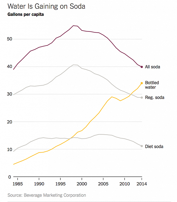 1960年代到1990年代,汽水公司經(jīng)歷過銷售量猛漲。而過去二十年里,汽水在美國的銷量暴跌了將近25%。而行業(yè)調(diào)研機構(gòu)Beverage Digest最新數(shù)據(jù)顯示,美國汽水2016年的銷量滑入了近31年來的最低谷,較去年銷量又降低了0.8%。