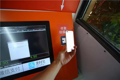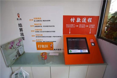 將商品放置在打包臺,有打包袋可以自行取用,旁邊的電腦上也就顯示了所購商品的數(shù)量和價(jià)格,選擇微信或是支付寶結(jié)算,調(diào)出付款碼,在電腦旁掃碼裝置上掃描就可以完成結(jié)賬,這時(shí)候,超市出去的大門就打開了。