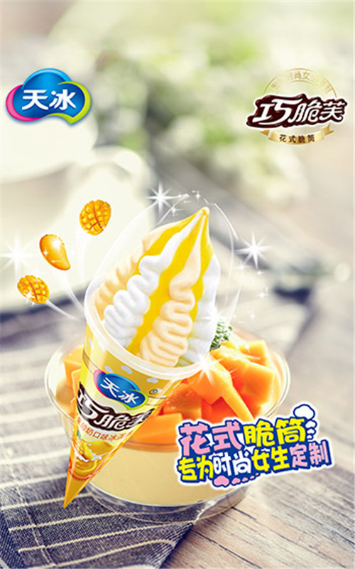 巧脆芙是花式脆筒類冰淇淋,分為芒果酸奶口味和牛奶口味兩種,是天冰目前主推的核心單品。