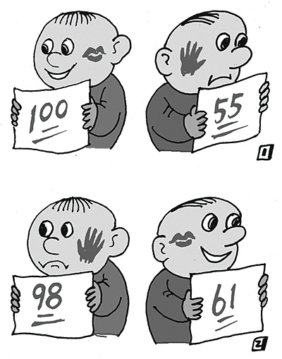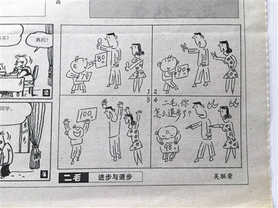 一個(gè)孩子考了100分,受到表?yè)P(yáng)。后來(lái)考了98分,結(jié)果被打了耳光;另一孩子考了55分,被打了耳光。第二次考了61分,卻受到表?yè)P(yáng):這幅名為《進(jìn)步與退步》的四格漫畫(huà),入選為2016年高考全國(guó)卷1的作文題目。