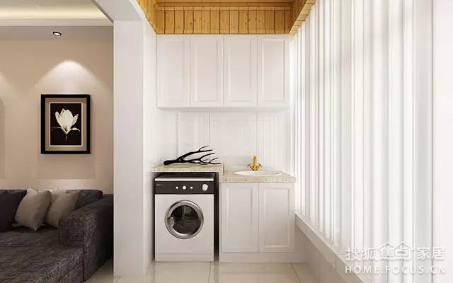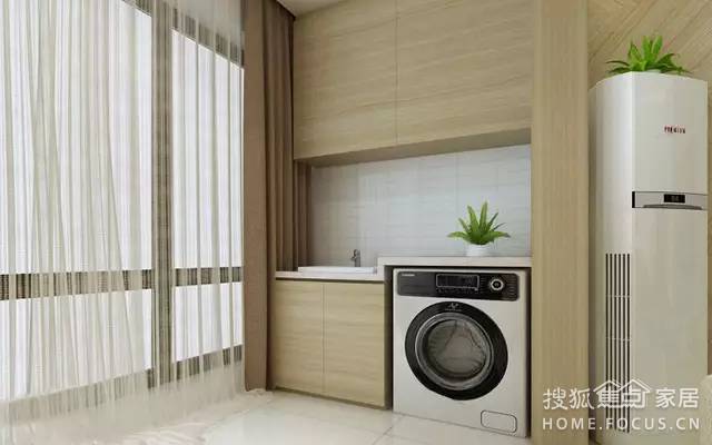 為了避免洗衣機(jī)影響整體簡(jiǎn)約的美感,把洗衣機(jī)組合柜設(shè)置在落地窗封閉式陽(yáng)臺(tái)的一側(cè)角落里,戶主將這個(gè)角落打造成了一個(gè)簡(jiǎn)單又實(shí)用的空間,洗衣機(jī)左側(cè)是洗手池,上方有柜子,可以用來放置洗衣粉等用品,洗衣機(jī)上方的綠色植物又可以起到點(diǎn)綴作用,柔化了洗衣機(jī)的生硬形象。