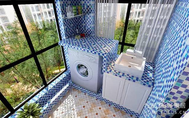 這一款讓人眼前一亮的陽(yáng)臺(tái)放洗衣機(jī)效果圖便是地中海風(fēng)格陽(yáng)臺(tái),戶主大膽采用藍(lán)白相間的馬賽克墻面,配合白色的洗衣機(jī)組合柜和洗手池,給人一種置身海邊的感覺。由于陽(yáng)臺(tái)兩面都是落地窗,戶主便在轉(zhuǎn)角的墻面上設(shè)了一個(gè)置物架,用來放洗手液、洗衣液、洗面奶等用品,使用起來十分方便。
