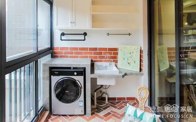 這是一款青春活潑的陽(yáng)臺(tái),地面和墻面都是復(fù)古紅磚風(fēng)格,加上配合洗衣機(jī)的盥洗區(qū)下方的管道直接暴露出來,顯得十分自由隨意,洗衣機(jī)上方懸掛的兩個(gè)晾曬架,可以用來掛毛巾、小衣物等,這樣的陽(yáng)臺(tái)洗衣機(jī)角落實(shí)用又有格調(diào),適合年輕人。
