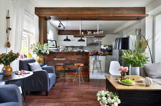 雖然是小戶型,綠植的面積絲毫不含糊,屋里屋外都擺著大件的綠色盆栽;花束則插在更有設(shè)計(jì)感的瓶罐中。和睫毛聊起了為愛布置花房的蓋茨比,雖然不如他闊綽,也真像把花園搬進(jìn)了家里。