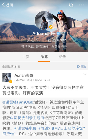 那么,《情劍》的兩位“主演”謝霆鋒與鐘欣桐為什么沒來宣傳本片呢?馬云對此表示:“兩位演員都還有別的戲要拍,沒時間來宣傳我們的電影?!钡皫兹崭勖絾柤傲藘扇说慕?jīng)紀(jì)人霍汶希,對方稱《情劍》片方根本沒有通知他們上映的事,更沒有邀請二人宣傳。而在微博上認(rèn)證為“香港演員、謝霆鋒助手”的網(wǎng)友“Adrian表哥”也發(fā)微博指責(zé)片方并沒有得到謝霆鋒的同意,是奸商行為。另外,記者也查閱了《情劍》的官方微博,該官微在開辦至今僅發(fā)7條微博,有90個粉絲。可以說,《情劍》除了一組有“抄襲嫌疑”的海報之外幾乎是在沒有任何宣傳的情況下推進(jìn)院線的。