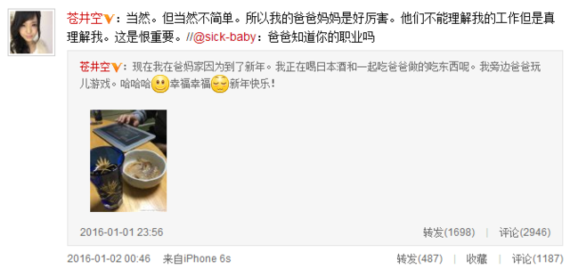 隨后有網(wǎng)友留言,問及“你爸爸知道你職業(yè)嗎?”蒼井空很是坦誠(chéng)回答:“當(dāng)然。但當(dāng)然不簡(jiǎn)單。所以我的爸爸媽媽是好厲害。他們不能理解我的工作但是真理解我。這是很重要。”更有網(wǎng)友敏感地問道:“蒼老師的父親也看過她的作品嗎?”蒼井空反問“如果你爸爸的話怎么樣”讓網(wǎng)友為其機(jī)智點(diǎn)贊。
