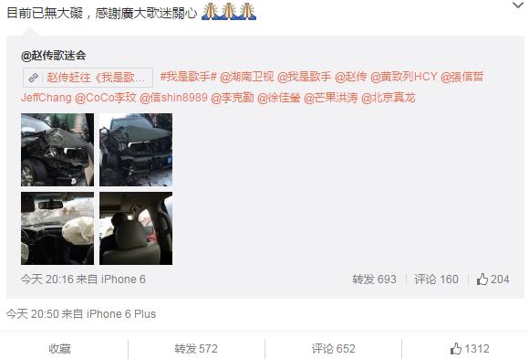 2月4日晚,ID為“趙傳歌迷會(huì)”的微博發(fā)布了一篇文章,描述了歌手趙傳在前往《我是歌手》錄制現(xiàn)場(chǎng)的途中發(fā)生車禍的情況。文章發(fā)布后不久就引發(fā)了網(wǎng)友熱議,趙傳本人也轉(zhuǎn)發(fā)了該微博并寫(xiě)到:“目前已無(wú)大礙,感謝廣大歌迷關(guān)心”。確認(rèn)了消息的真實(shí)性。