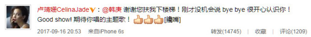 去年9月16日,第31屆金雞獎(jiǎng)舉行頒獎(jiǎng)典禮,盧靖姍曾與韓庚搭檔頒發(fā)最佳音樂(lè)獎(jiǎng),同臺(tái)互動(dòng)。下樓梯時(shí),韓庚細(xì)心地扶著盧靖姍,非常紳士。事后,盧靖姍還發(fā)微博專(zhuān)門(mén)感謝韓庚。