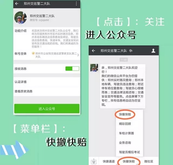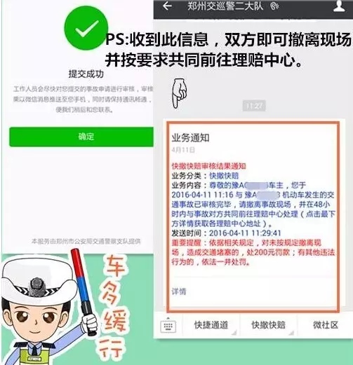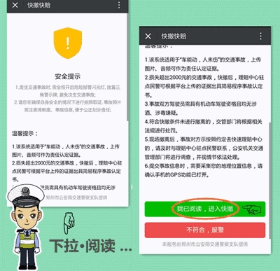 一起簡單的輕微交通事故,如不及時撤離現(xiàn)場,便極易引起交通擁堵。今后,這一現(xiàn)象將在我市得到有效解決,鄭州市交警支隊科研所和河南省保險行業(yè)協(xié)會聯(lián)合研發(fā)的交通事故快撤快賠功能在鄭州交巡警二大隊微信公共平臺上線并試運行。