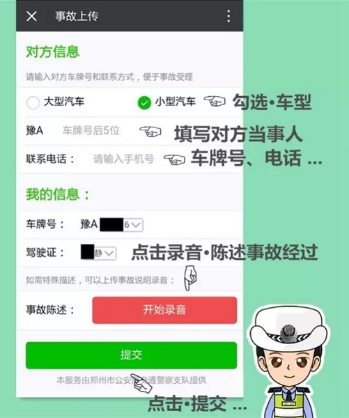 填寫“事故描述”相關(guān)內(nèi)容,輸入對方車號和聯(lián)系方式。并在事故陳述處點擊“開始錄音”,描述事故發(fā)生詳細(xì)地點和成因后提交。