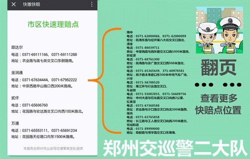 4、適用范圍:交警二大隊轄區(qū)內(nèi)嵩山路(含)嵩山路以西區(qū)域及中原區(qū)、西開發(fā)區(qū)全境,公共道路上發(fā)生的兩車事故,車輛能夠正常駕駛,沒有人員受傷,均適用。