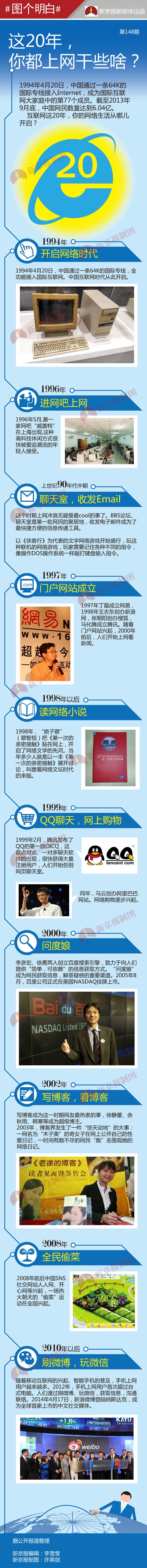 1994年4月20日,中國通過一條64K國際專線接入Internet,成為國際互聯(lián)網(wǎng)大家庭中的第77個成員。截至2013年9月底,中國網(wǎng)民數(shù)量達到6.04億?;ヂ?lián)網(wǎng)這20年,你的網(wǎng)絡生活從哪兒開啟?