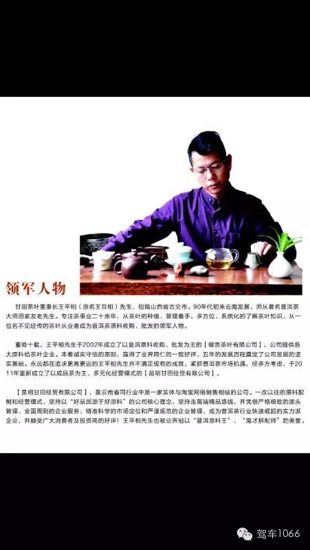 甘田茶葉董事長王互相先生,是近年來普洱茶領域的傳奇人物之一,從事普洱茶產(chǎn)業(yè)研究二十余年,積累并沉淀了豐厚的普洱茶知識和經(jīng)驗。長年累月地深入云南省的各大普洱茶產(chǎn)區(qū)調(diào)研,被業(yè)界冠以“普洱原料王”“鬼才拼配師”等美譽。王互相先生早年曾是國內(nèi)某大型普洱茶企業(yè)的高級管理人員,工作多年后,鑒于對普洱茶產(chǎn)業(yè)的獨到見解,成立了以原料收購和批發(fā)為主的“御貢茶葉”,為多家知名茶企提供原料支持地,深受業(yè)界好評,后經(jīng)十年發(fā)展,于2011年重新創(chuàng)建了以成品為主,多元化經(jīng)營模式的“昆明甘田經(jīng)貿(mào)有限公司”。