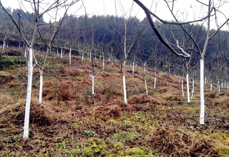 入冬后及時用涂白劑將核桃樹干和主枝均勻涂刷,使樹體溫度變化穩(wěn)定,不會有凍凍融融的情況,既防凍、防日灼,又能殺死樹干中的病菌、蟲卵和成蟲,還可有效防止牲畜啃咬樹枝樹皮。涂白在11月中旬進行。