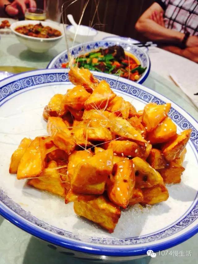 吃完了硬菜,總需要來道餐后甜品吧?拔絲類的菜品就算是咱們中式菜中的甜品了,看這拔絲的效果就知道廚師的手藝如何,長長的拔起,再往冷水里沾一沾,好吃好玩兒,吃出了童年的感覺?。?/p>