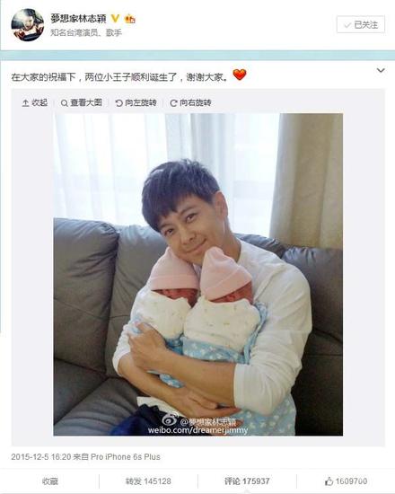 12月5日,林志穎發(fā)微博宣布自己又有了兩個(gè)兒子,眼神里滿是父愛。陳若儀完勝那個(gè)睡了偶像的妹子好不好,她直接給偶像生了三只猴子!哦不,是三個(gè)兒子。
