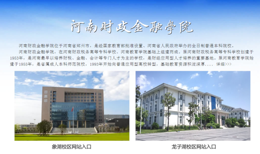 目前,河南財政金融學(xué)院共有兩個校區(qū),分別座落在鄭東新區(qū)的象湖、龍子湖畔,在校生近兩萬人,占地面積100.6萬平方米(1509畝),建筑面積58.69萬平方米。