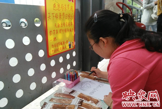 映象網(wǎng)快訊(記者 何葉 文/圖)昨天(5月14日)是母親節(jié),在金水路快速公交站臺(tái)內(nèi),別樣的慶祝母親節(jié)活動(dòng)正在進(jìn)行著,凡是在站臺(tái)內(nèi)畫出母親慈祥笑容的乘客,都能獲得梳子一把,為辛勞的母親梳梳頭。