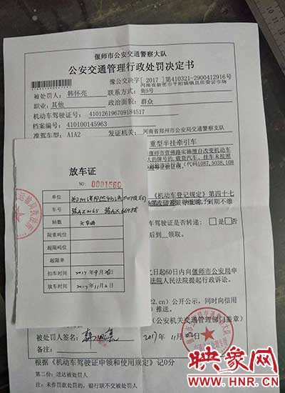 11月2日下午16時(shí)許,偃師市交警大隊(duì)給韓先生開具了公安交通管理行政處罰決定書【2017】410321-2900412916號(hào),處罰900元。韓先生急匆匆去交了900元罰款后,拿了交警隊(duì)的交款單去了交通局,交通局于當(dāng)天晚上17時(shí)30分許,給韓開具放車單。韓去停車場看到自己的車時(shí),已經(jīng)是當(dāng)天晚上20時(shí)以后了。