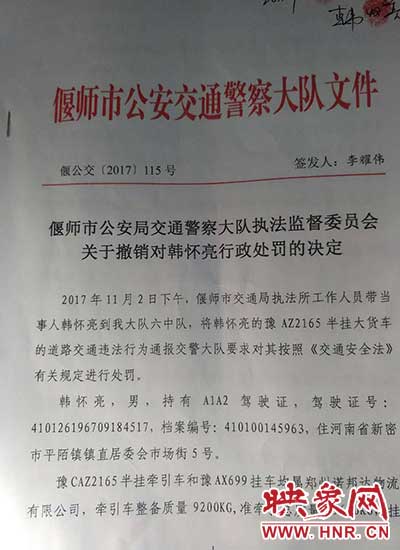 17日下午13時(shí)許,在廣電南路上,法制科黎科長和督察李警官帶著“偃師市公安局交警大隊(duì)執(zhí)法監(jiān)督委員會(huì)關(guān)于撤銷對(duì)韓懷亮行政處罰的決定”文件與韓先生見面。
