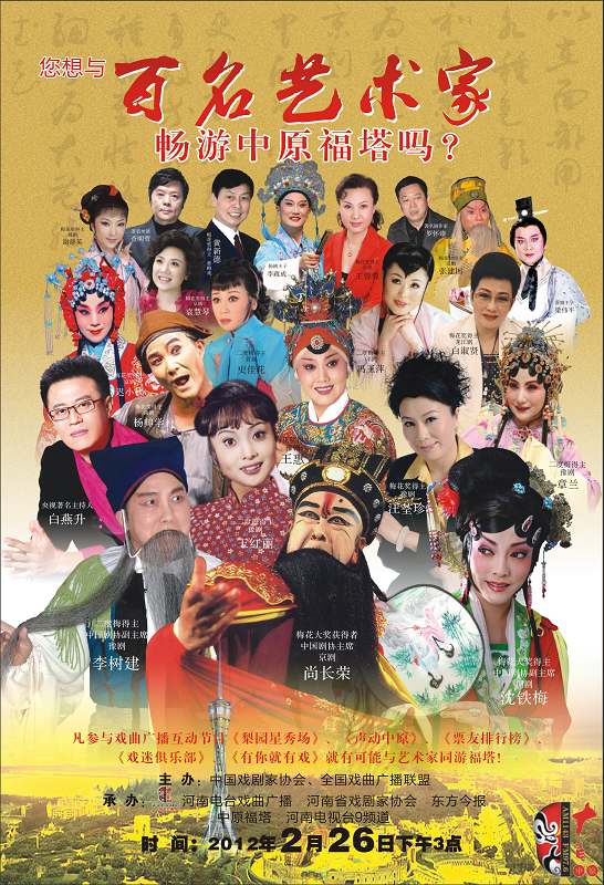 河南電臺戲曲廣播、河南省戲劇家協(xié)會發(fā)起并聯(lián)合中國戲劇家協(xié)會、全國戲曲廣播聯(lián)盟共同推出的“全國百名藝術(shù)家暢游中原福塔”觀光活動將于2012年2月26日下午3點(diǎn)舉行。