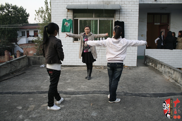 稍有空余他們就自覺的練功,圖為劉粉霞在為學(xué)生演示動(dòng)作