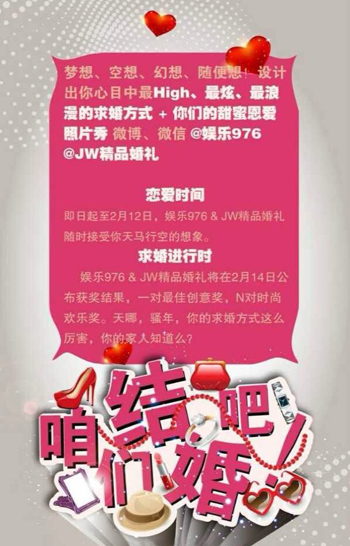 2月12日娛樂976全新上線,我們?yōu)槟蛟煲粓鰪V播史上最時(shí)尚最浪漫的求婚派對+結(jié)婚盛典!只要心中有愛,求婚方式可以多姿多彩,怎樣的求婚才能讓她難忘、心甘情愿說“I do!”?現(xiàn)在,只要有創(chuàng)意的求婚方式,就可以獲得10萬元求婚+結(jié)婚盛典!求婚,你準(zhǔn)備好了嗎?咱們結(jié)婚吧!