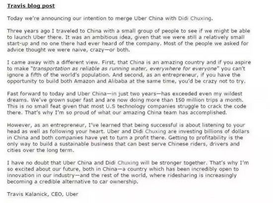 今天我們宣布,我們打算讓優(yōu)步中國(Uber China)與滴滴出行進(jìn)行合并。