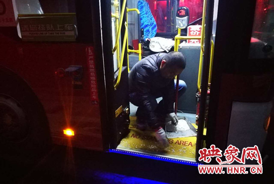 映象網訊(記者 燕子丹 文/圖)13日夜間,降雪如約而至。鄭州公交二公司全面啟動惡劣天氣應急預案,應急工作領導小組于13日夜間分赴各個公交場站,對公交車輛進行安全檢查,在場區(qū)、站點等地鋪灑融雪劑,保證車輛第二天能夠安全上路。