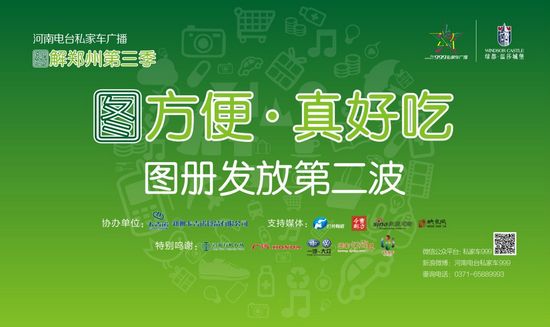 河南電臺(tái)私家車廣播2013大型公益系列活動(dòng)——“圖解鄭州”第三季圖方便·真好吃,圖冊(cè)發(fā)放第二波于2013年7月7日在鄭州市東風(fēng)路與天明路交匯處的天旺優(yōu)庫和商都路與七里河南路交匯處的華豐燈飾界免費(fèi)發(fā)放。