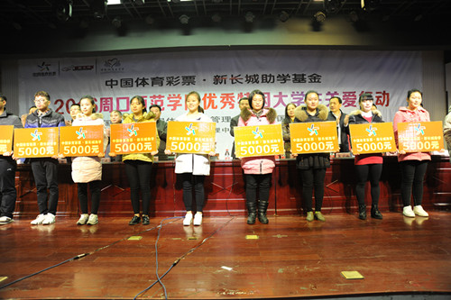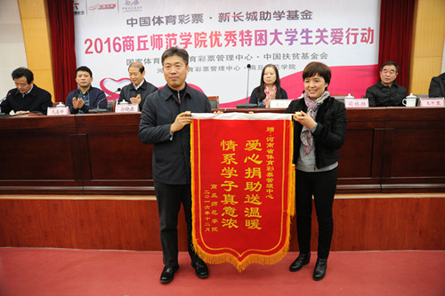 2016年12月7日、8日,中國(guó)體育彩票品牌公益項(xiàng)目“中國(guó)體育彩票新長(zhǎng)城助學(xué)基金”2016年捐贈(zèng)儀式分別在商丘師范學(xué)院和周口師范學(xué)院舉行。據(jù)悉,通過此次捐贈(zèng)活動(dòng),河南省體育彩票管理中心共向兩個(gè)學(xué)校來自全國(guó)14省區(qū)的120名優(yōu)秀貧困大學(xué)生每人捐助5000元,幫助他們和他們的家庭,減輕學(xué)習(xí)生活中的經(jīng)濟(jì)負(fù)擔(dān)。
