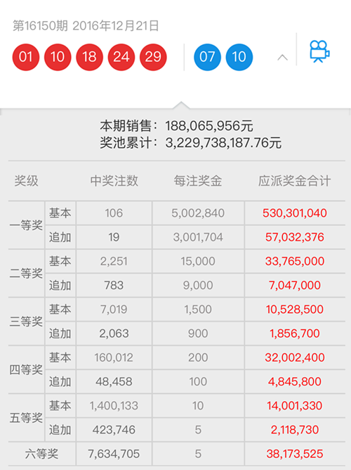 [摘要] 北京時(shí)間2016年12月21日晚,體彩大樂透第16150期開獎(jiǎng),開獎(jiǎng)號(hào)碼前區(qū)為“01、10、18、24、29”,后區(qū)開獎(jiǎng)號(hào)碼為“07、10”。