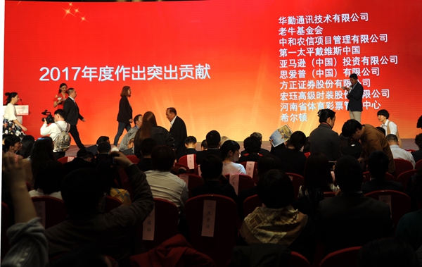 河南省體育彩票管理中心榮獲中國扶貧基金會“2017年度扶貧突出貢獻(xiàn)獎”,中心黨支部書記王海新代表單位領(lǐng)取了獎杯和證書。