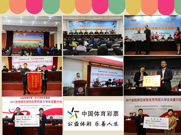 河南省體育彩票管理中心自2013年開始,已經(jīng)連續(xù)五年通過國家體育總局體育彩票管理中心與中國扶貧基金會合作,以“中國體育彩票·新長城助學(xué)基金”形式,向信陽師范學(xué)院、河南師范大學(xué)、許昌學(xué)院、商丘師范學(xué)院、周口師范學(xué)院、洛陽師范學(xué)院、安陽師范學(xué)院共計(jì)7所院校的400名優(yōu)秀貧困大學(xué)生累計(jì)捐助助學(xué)金200萬元。2015年,河南體彩中心在前兩年每年捐助50名貧困大學(xué)生的基礎(chǔ)上,將受助名額增加到了60名,2016年開始又將捐贈學(xué)校從一所增加到兩所,受助學(xué)生名額從60名又增加到120名,每個學(xué)生的受助金額從4000元提高到了5000元,希望幫助更多的困難學(xué)生及其家庭減輕經(jīng)濟(jì)負(fù)擔(dān)和精神壓力。