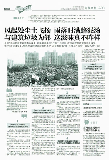 關(guān)于渣土車和建筑垃圾,《河南商報》一直都在關(guān)注。7月30日報道,《河南商報》曾曝光的3輛渣土車被“開除”出鄭州市場;8月26日至28日,《河南商報》刊發(fā)系列報道,關(guān)注鄭州市建筑垃圾問題。