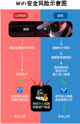金山毒霸安全工程師趙昱表示:“WIFI釣魚熱點(diǎn)其實(shí)就是在數(shù)據(jù)傳輸?shù)纳嫌卧O(shè)置了一道閥門,所有客戶的數(shù)據(jù)都通過這個(gè)閥門與相應(yīng)的網(wǎng)站進(jìn)行傳輸,黑客通過一些特定的攻擊設(shè)備,就可以對(duì)這些數(shù)據(jù)進(jìn)行記錄和抓取分析。這樣,客戶的相關(guān)信息就會(huì)被黑客獲取?!?