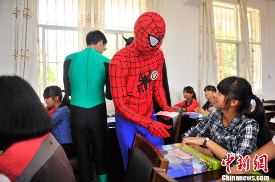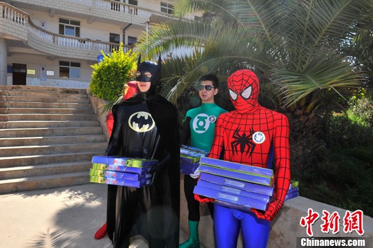 5月29日,在六一兒童節(jié)來臨之際,祥鵬航空的安全員變身超級英雄,來到云南省昆明市晉寧縣的學(xué)校,為長期資助的困難學(xué)生送上兒童節(jié)禮物。中新社發(fā) 劉冉陽 攝 5月29日,在六一兒童節(jié)來臨之際,祥鵬航空的安全員變身超級英雄,來到云南省昆明市晉寧縣的學(xué)校,為長期資助的困難學(xué)生送上兒童節(jié)禮物。