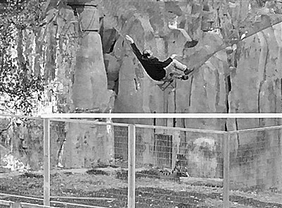 據(jù)公園視頻顯示,上午11點(diǎn)09分,男子出現(xiàn)在監(jiān)控畫面內(nèi),獨(dú)自坐在纜車上,行至虎山上方時(shí),男子伸出右手拉住纜車車壁,再用左手拉住另一邊車壁,試圖站起來。隨后,他用雙手撐著纜車圍欄蹲在座位上,將雙腿完全伸出纜車外,約10秒鐘后,縱身跳下,落在虎山上方護(hù)網(wǎng)上,顛簸了幾下后,男子跪爬在網(wǎng)上,而此時(shí)虎山中的一只老虎受到驚嚇,在園子里來回走動。11時(shí)31分,該男子被公園工作人員用云梯救下。